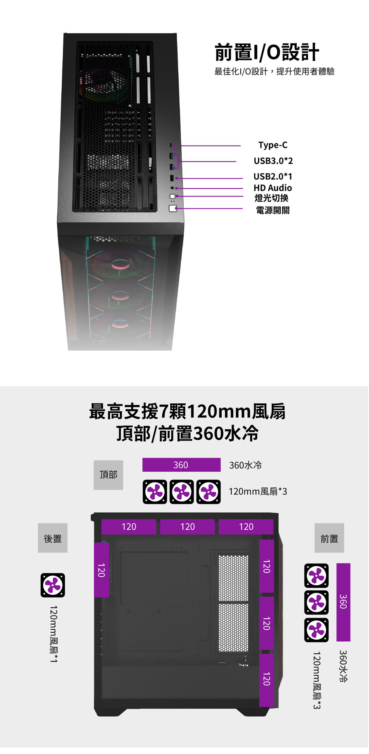 前置輸出入埠: 電源鍵 / 燈效鍵 / USB 3.0 * 2 / USB 2.0 * 1/ HD Audio / Type-C * 1